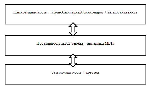 Сам краниосакральный механизм (КСМ) позволяет двигаться ликвору в краниоспинальной полости, тем самым контролируя постоянство внутричерепного давления [29]. Этот механизм включает биомеханику его основных анатомических структур (рисунок 1 авторов).